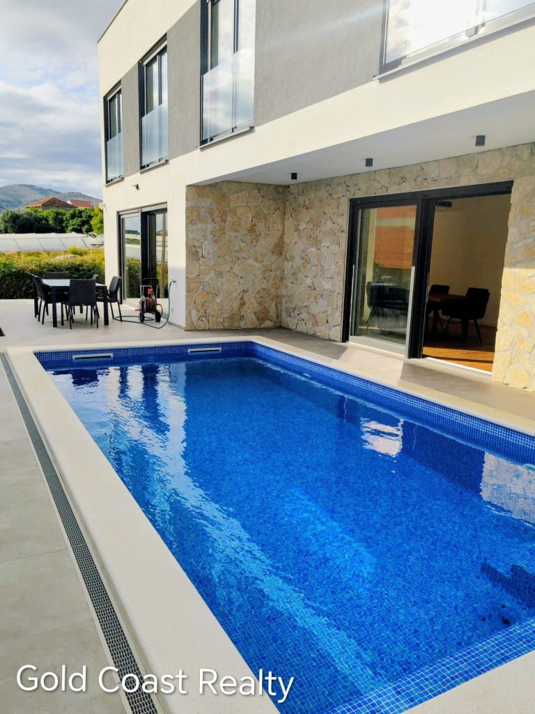 A must see newly built home ideal for either everyday living or rental property. Located 5km from Split airport, 15km from Split city and walking distance to many amenities with views of the sea and Trogir bridge. The home itself offers three outdoor parking spaces as well as garage space.The outdoor area is private with sitting and grilling space as well as a pool and lounge chairs. Upon entering, there is a spacious foyer on the ground level leading to a full bathroom, kitchen and spacious dining area. The living area is open floor plan with views of the terrace. The first floor consists of 4 spacious bedrooms and two fully equipped bathrooms. The basement level is a large open floor plan with endless possibilities such as a recreation room or home gym and plenty of storage space.
